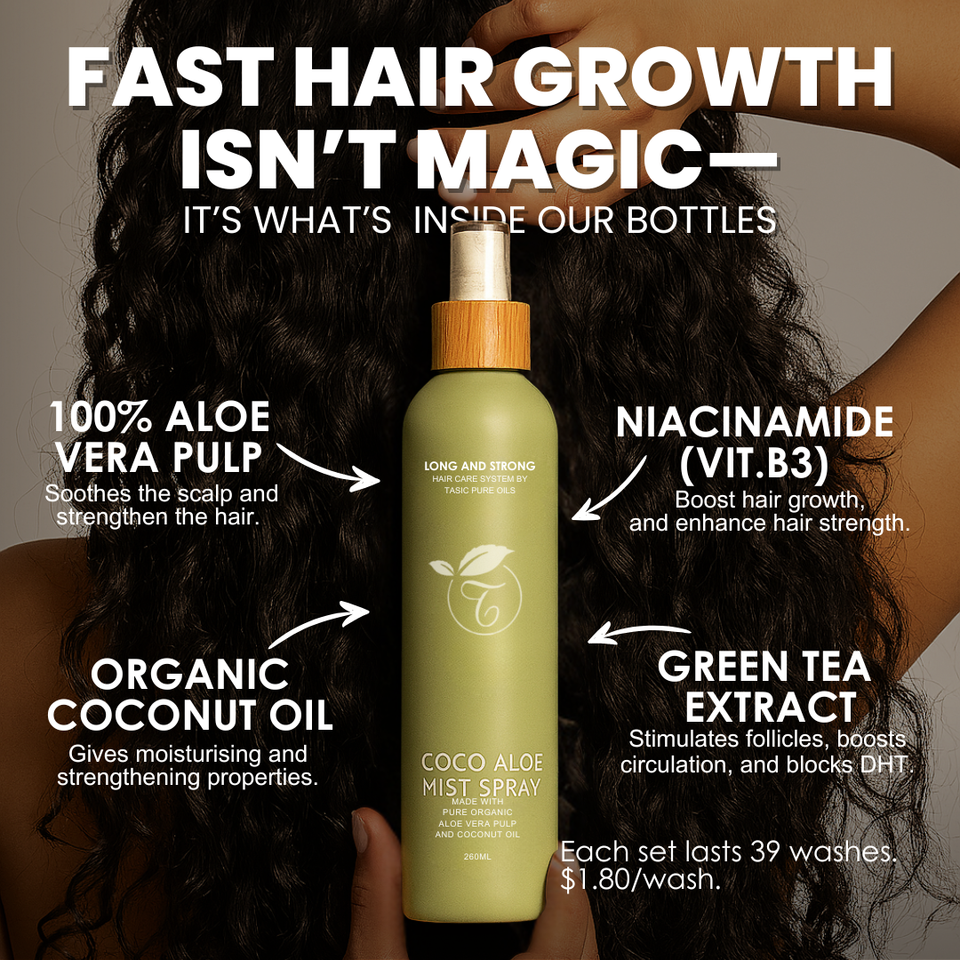 The Long & Strong Hair Care System by Tasic Pure Oils helps fight back naturally. Aloe vera pulp hydrates and soothes the scalp, keeping follicles healthy and open, while coconut oil nourishes the roots and helps shield follicles from DHT’s shrinking effect. This nutrient-rich care supports stronger growth and healthier lengths.