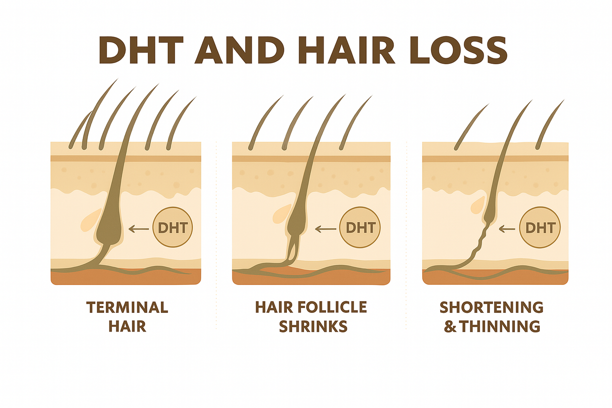 One of the main causes of thinning hair is DHT (Dihydrotestosterone). When DHT binds to hair follicles, it gradually shrinks them, leading to weaker strands and slowed growth.